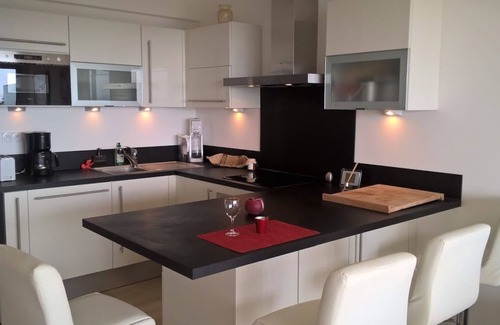 The main room has a sitting area with a current high-end convertible sofa, a flat screen TV. The kitchen is open to the modern living room and fully equipped with a combination of bright white and slate with an American bar for very convivial lunches. ;