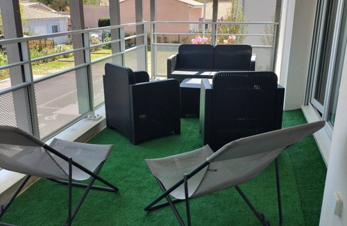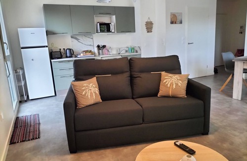 Between ocean, lake and forest! Bright apartment with sitting area on balcony is located in Carcans. Between ocean, lake and forest! Bright apartment with sitting area on balcony provides accommodation, featuring Parking, TV, Balcony/Terrace, among other amenities. This Apartment features Parking, TV, Balcony/Terrace, to make your stay a comfortable one.