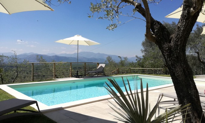 Independent apartment, 85 m². Kitchen opening onto a private terrace of around 20 m² with views of the region. On hot summer days, you can lounge by the salt swimming pool at the foot of the olive trees.