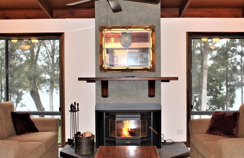 The sliding doors lead to the covered outdoor entertaining area where you can take in the stunning water views as well as 2 BBQs (wood and gas) and a wood fired pizza oven. The house has air conditioning, 2 indoor fireplaces (wood supplied) as well as an outside fire pit and 2 outdoor heaters to enjoy in the Winter months. A deep water mooring with complete access to the water for fishing or kayaking (3 supplied) to enjoy throughout the Summer.