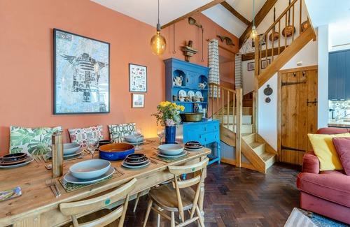 Through the characterful arched ‘cart door’ style French doors, you’ll find a haven of rustic charm and homely warmth in the spacious open-plan lounge/kitchen/diner. The reclaimed parquet floor, roaring wood burner and gorgeous ceiling beams set a wonderfully peaceful ambience that beckons tired travellers to unwind and dine with loved ones long into the evening, the bright, bold hues perfectly compliment the colours of your stunning surroundings. There are two bedrooms on offer, one en-suite super-king-size zip-and-link bedroom (can be made up as a twin on request at time of booking) on the ground floor, as well as another sumptuous en-suite super-king-size zip-and-link bedroom (can be made up as a twin on request at time of booking) on the gallery level upstairs – which boasts a high vaulted ceiling and delightful views across the courtyard and canal beyond.