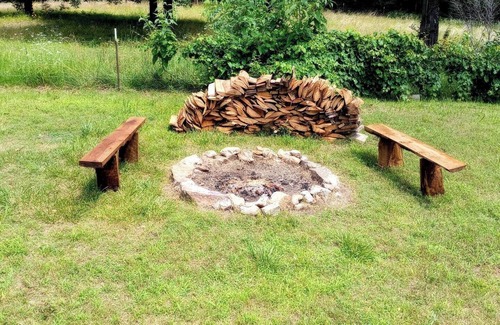 The living room has a small love seat that folds out into a twin sized bed. The spacious deck out back has a picnic table and an umbrella and a charcoal BBQ grill. There is a fire pit in the yard with two benches to sit on by the fire. The front porch as two large cedar rocking chairs and a porch swing, there is a shed in the back that has a washer and dryer, so you can keep clothes clean as needed.