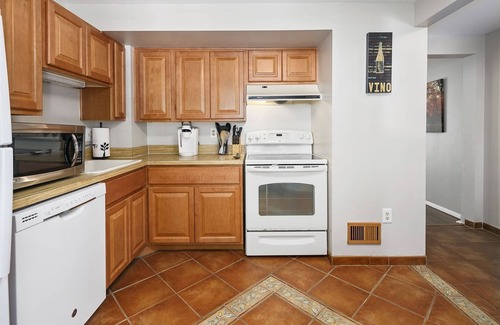 The fully-equipped kitchen is immediately to your left, featuring inlaid tile floors, a flat-top electric range, full-size refrigerator, and dishwasher. With an abundance of cabinet and counter space, the family chef will set to work in no time at all!