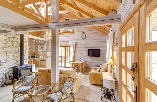 Large, beautiful, comfortable single-family house "Bieszczady Chata", built in 2015. On the outskirts, in a quiet, sunny, elevated position on a slope, in the countryside. For shared use: property 3'500 m2, natural garden 2'500 m2, lawn for sunbathing. Hot tub, table tennis, terrace, garden furniture, barbecue, children's playground. In the house: WiFi, trampoline, central heating system, washing machine. Available: bicycles. Steep motor access (via unmade road). In Winter: please take snow chains. Parking at the house. Carport. Shop, grocery, bus stop 800 m. Ski lift 35 km. The summer kitchen allows guests to stay outdoors all the time and enjoy the beautiful views. You can buy vegetables, fruit and cold-pressed oil on site. You can try local products (also available for purchase) or order a homemade dinner. Homemade dinner can be ordered at least 3 days in advance. Winter - winter sports, T-bar lifts (10 km) and chair lifts (Puławy Górne - 36 km). At a distance of 50 km. Slovakia, Svidnik - a large Aquapark with thermal waters.