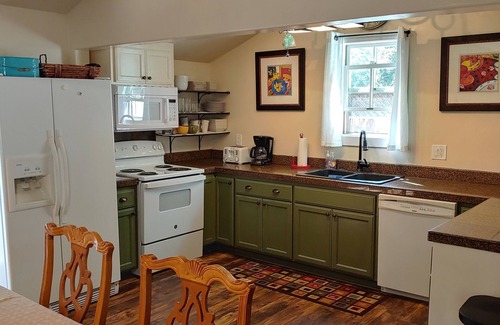 Our home is on 1.3 acres all fenced in, with a big back and front yards with gardens and a big playhouse. Very private with an electric gate and a ton of parking. The house is a 2000sf two-story with a balcony. With one bedroom and bath downstairs, 2 bedrooms upstairs and full bathroom. The downstairs kitchen is fully equipped, a stove, dishwasher, side-by-side fridge/freezer, toaster, convection microwave, and coffee maker. Stocked spice-rack kitchen towels, everything you need, granite counters, and a breakfast nook. There is a laundry room with a washer and dryer. It has a big 20 X 15 living room, roll-a-way bed, and a formal dining room.