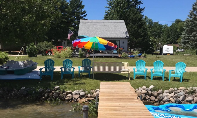 2 - 8 foot sliding doors leading out to a large spacious deck with a beautiful lake view. 1 bedroom downstairs 2 upstairs. Laundry room with washer and dryer. Cottage has large yard for outdoor fun with bonfire pit, bag toss game, horse shoes, bad mitten/ volleyball game. Dock with 2 kayaks, paddle boat & canoe available. Some life jackets available. You can bring your own Motor craft public access right down the road and you can tie up to the dock in front of the house.