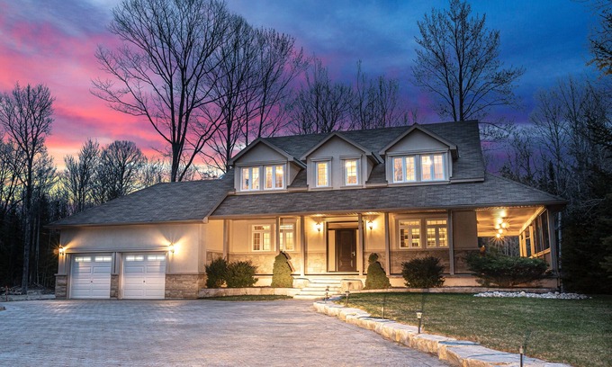 The home features an open concept floor plan, cathedral ceiling, kitchen centre island, Main Floor Master Bedroom W/Ensuite, Living Room Overlooks A Stunning Backyard With Private Forest In The Background, 4Bdrm and 2 Bdrm Basement easily accommodates sixteen people With A Rec-Room, Wrap Around Porch, Manicured Grounds With Tree House And Brand New 7 Seater JACUZZI.