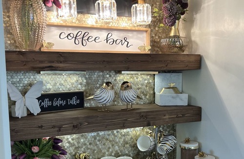 Outdoor Fire pit and Grill, Porcelain Floors, Beautiful Kitchen with Breakfast Nook, Double Oven and a fully stocked beautiful coffee bar.