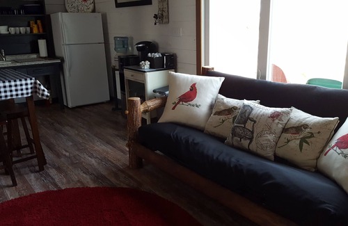 The Bunkhouse is a 900 square foot barn with loft and a wrap around porch. It has 4 queen size iron beds, a full size willow futon all with plush mattresses and a daybed that makes into a King or 2 twins. It can sleep 12 comfortably and is the perfect romantic getaway or meditation retreat. There is a kitchen area with microwave and fridge, a Gas Grill on the patio, Kuerig coffee maker for coffee drinkers and organic tea. The Barn is an open plan with windows and the bathroom is large with an oversized tile shower and plenty of room for dressing.