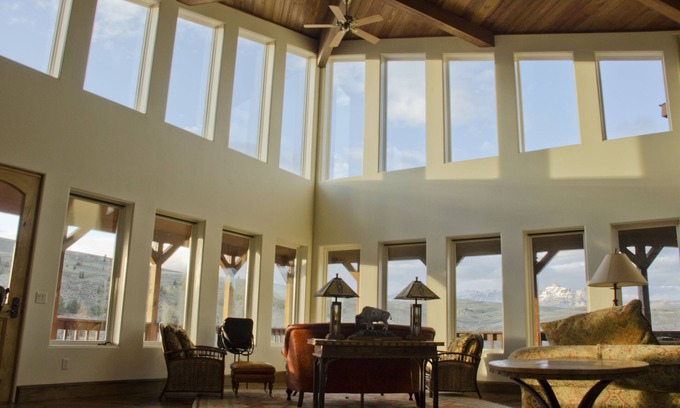 This exclusive home sits high on top of the hill. The all-glass window front has an unobstructed view over the mountain range, the valley and the Wind River.