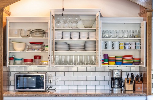 In the house there are nine spacious bedrooms including three large bunk rooms. Many of the bedrooms feature king beds and sofa sleepers for extra sleeping options. There is one bunk room on the main floor for smaller kids. The spacious kitchen is stocked with many of the things you would need for your stay. There are plenty of plates, glasses, silverware and plastics dishes for the kids. There is a crock pot, instant pot, griddle, blender, mixer, pots, pans and cookie sheets.