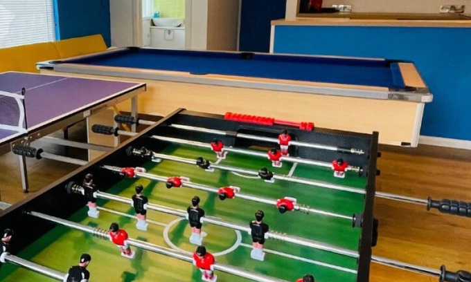Entertainment abounds with interactive darts, arcade delights, and an outdoor pool/foosball table. Unwind in the hot tub or enjoy twilight cinema with our outdoor projector. The spacious lounge, dining area, and modern kitchen invite convivial gatherings.