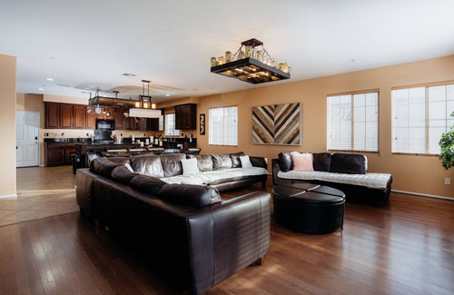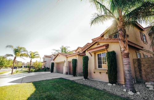 LARGE 4300sqft HOME! Optional 7th bedroom! 3 car garage DRIVEWAY + RV parking space! Huge cozy pool/spa home minutes away from Fontana Speedway & Ontario Airport! WIDE OPEN AND SPACIOUS HOME! THE BEDROOMS 6 bedrooms with memory foam KING mattress PLUS 65" TVs! LIVINGROOMS Three living rooms which consist of two downstairs and one upstairs. One main living room, an upstairs loft, and a lounge! A POOL AND SPA DINING Seats 16 - beautiful private dining area PLUS dining table in kitchen!