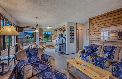 Big Horn features a well-equipped kitchen complete with a dishwasher and fridge, allowing you to prepare delicious meals for your loved ones. Unwind in the living area by the easy-to-use gas fireplace or enjoy your favorite shows on the satellite smart TV with WIFI connectivity. The master bedroom offers a plush queen bed and private bath, while the second bedroom accommodates up to two guests with its twin beds and adjacent full bath. For larger groups, the comfortable queen sleeper sofa in the living room provides additional sleeping space, easily accommodating up to six individuals for your special occasion.