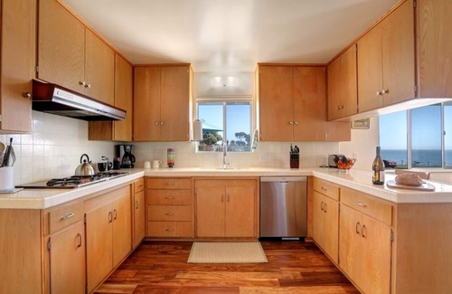 Seacliff House is a single level newly redecorated and landscaped Shell Beach home with spectacular unobstructed ocean view across San Luis Bay to Point Sal and beyond. This 1300 sf floor plan has two spacious bedrooms both with king beds. The master has a connecting bath with a large glass-tiled walk in shower with frameless glass surround, custom cabinetry, and granite counter with two vessel sinks. The second bedroom has ocean view and the second bath has a soaking tub with tiled shower over it, custom cabinetry and granite counter and details.