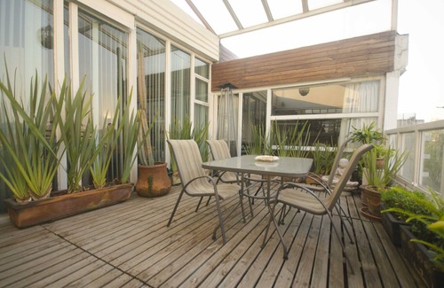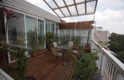 7th Floor, high ceiling, 3 bedroom, large panoramic living room, wooden deck terrace, secure penthouse for rent welcomes you. The apartment houses 6 people in 3 king Size beds. It has a comfortable spacious living room, a dinner table for 8pax and a sunny wooden decked terrace with unparalleled view to Park and Castillo de Chapultepec. It also has a studio facing the city and a fully equipped kitchen. If desired, a cook is available to make breakfast or lunch and leave some cooked dishes for dinner. The apartment is of wooden floors. It has an eclectic decoration. Ranging from wooden antiques, leather couches, fabric reposée, polyurethane over leather main table and Mexican painting canvas on the wall, among diverse antique political posters and pictures. There is two 40 inch cable plasma TVs, a DVD, a Stereo System for Ipod, Internet (WIFI 20mbps and a 6mbps back up) and speakers on the terrace. There is one indoor parking space and 24hr security personnel. There is Ecobici (public bikes) less then a block away (One must register in advance with a credit card). The subway stop Juanacatlán is two blocks away. The Metrobus (bus that transits like a subway) 8 blocks away. Public buses run a block away, but I do not recommend those unless you want to have an adventurous exotic ride. Breakfast can be arranged most of the time for 40usd + groceries.