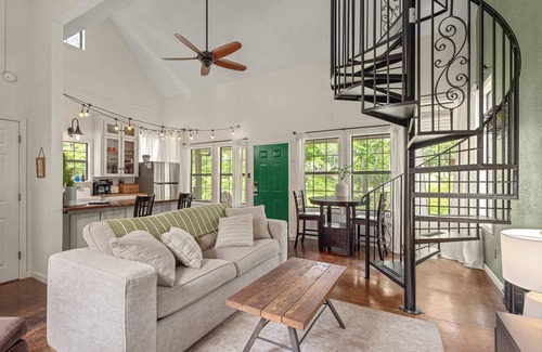 The Queen bedroom is lofted atop the living space, complete with a plush Queen-size bed, luxury linens and bedding, thoughtfully curated decor, and windows that cover the space in natural light. At nighttime, utilize our blackout curtains for a great night's sleep. A privacy wall provides separation from the bedroom and the main living area. Accessed by a spiral staircase.