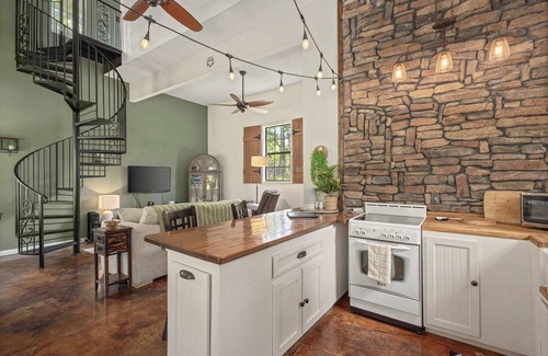 Sleeps up to four guests with (2) in our upstairs loft bedroom, complete with a Queen bed & blackout curtain & (2) on our downstairs Queen sleeper sofa. Our home is newly renovated with a fully equipped kitchen, brand new bathroom & laundry area, cozy living room with Smart TV, 2 fire pits, outdoor dining space, and a hot tub!