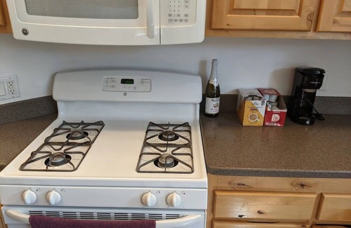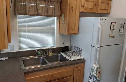 This charming, newly-remodeled cabin is cozy and well-equipped. Full kitchen with refrigerator, oven and range and double sink. Also well provisioned with coffee and cooking utensils.