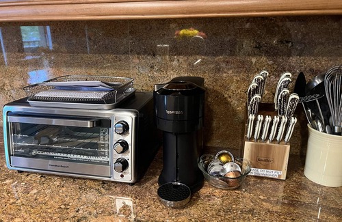 -Full kitchen + conveniences – Equipped with stainless steel appliances, breakfast bar, dining table for six, plus in-unit washer/dryer, Nespresso machine, and AC in the summer