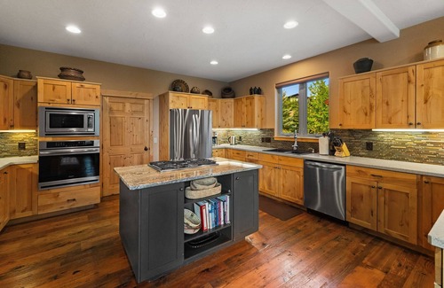 At the heart of the home is a spacious, fully equipped kitchen, thoughtfully stocked with all the essentials: pots, pans, utensils, plates, glasses, and more. Whether you’re preparing a hearty breakfast before a day of adventure or cooking a family-style dinner, this kitchen makes it easy.