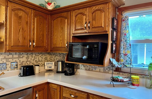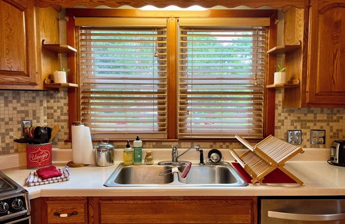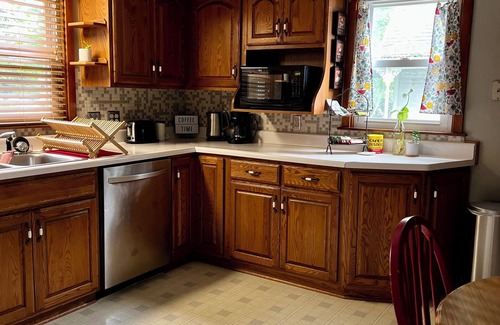 Guests will enjoy the spacious kitchen, fully stocked with all the dishes and gadgets you will need for making meals during your stay. Appliances include a full-sized refrigerator and freezer, dishwasher, oven, microwave, food processor, coffee maker, French press, electric kettle, toaster, hand mixer, and immersion blender. The refrigerator has a filtered, chilled water dispenser (no ice dispenser), and there is also a Brita pitcher for room temp filtered water.