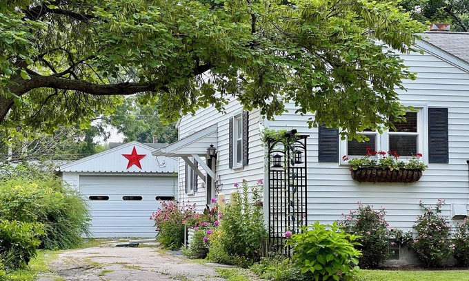 If you choose to, please feel free to walk down the driveway and venture through the old metal gate into the lovely and spacious back yard. Here guests will find a small brick patio with a table and 4 chairs, delightfully shaded under the natural pergola of a big red maple. Or, on the other side of the tree, sunbathe while relaxing in one of two red Adirondack chairs. Follow the brick path past the private garage to the raised garden beds and enjoy munching on garden vegetables, herbs, strawberries, and raspberries. Perennial flower beds attract butterflies and bees, while the huge elderberry bush makes for fantastic bird watching.