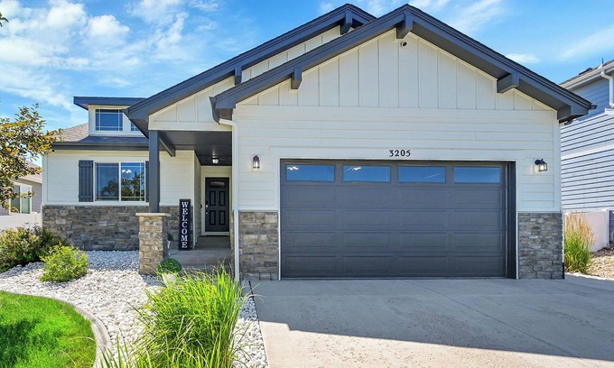Kick back in comfort at this spacious 4-bedroom, 3-bathroom ranch-style retreat in Evans, Colorado — perfect for families, professionals, or groups. Enjoy a cozy fireplace, home theater, full wet bar, PlayStation 4, TVs with Hulu and Netflix, a dedicated office, and a large, fully fenced backyard. Park securely in the 2-car garage with a Tesla EV charger, and enjoy smart lock self-check-in. It is just minutes from Fort Collins, Estes Park, Greeley, and Loveland.