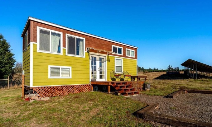 Perched atop a hill overlooking a tree farm, the Big Tiny at Buena Vista offers panoramic views of the valley and neighboring farmlands. Enjoy the sunset from your private deck, or, follow the walking trails to the lavender fields and relax. Guests may also visit the gift shop, which showcases lavender products made onsite; and the barn, where we have chickens goats, alpaca, sheep, a donkey and a mini horse. We also have four new baby goats and two baby sheep! A short drive from Silver Falls State Park and The Oregon Garden, the Big Tiny at Buena Vista is the perfect base camp for exploring the area. The farm is a short drive from Silverton, which offers walkable streets with dining, shopping, entertainment and community parks.