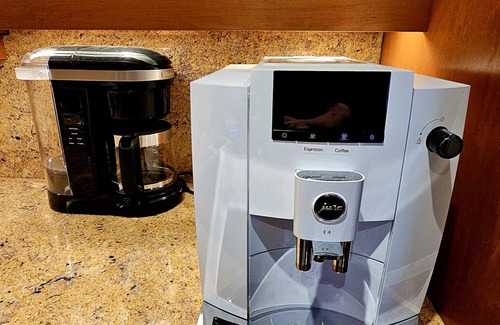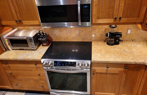 We also provide multiple cooking spices for your use (even a garlic press), and no morning starts off better than our fully featured coffee bar that offers you a choice of a Jura E4 super-automatic coffee machine, Kitchenaid 12-cup drip style and Keurig "pod" style electronic coffee makers along with a traditional French press for purists. A professional-grade Kitchen Aid burr grinder ensures your coffee beans are freshly ground to perfection. For those who enjoy tea, an electric kettle, tea press and tea pot are also supplied. We provide a fully stocked tea cupboard.