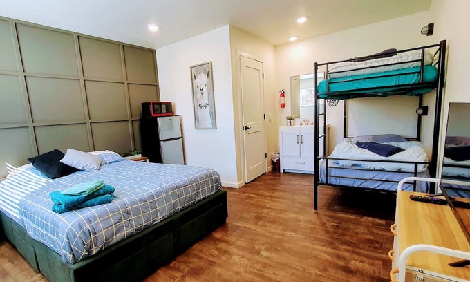 The room has a separate entrance and a private bathroom and is equipped with a fridge, microwave, TV, and more! Queen bed and bunk bed, great for two adults and two kids.
