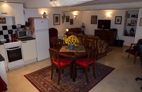 Bijou de Soleil is a 3 level village house including a basement. It boasts character with its stone exterior, Provence blue shutters and wood door. It has been recently renovated. It has an updated American kitchen, tile floor and stairwell, open beams, Master King Bed and 2nd bedroom Queen Bed with wood floors, adjoining (Jack & Jill) bathroom with new shower and additional toilette facilities in the basement plus a washer and dryer and french iron bed.