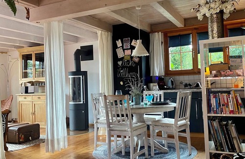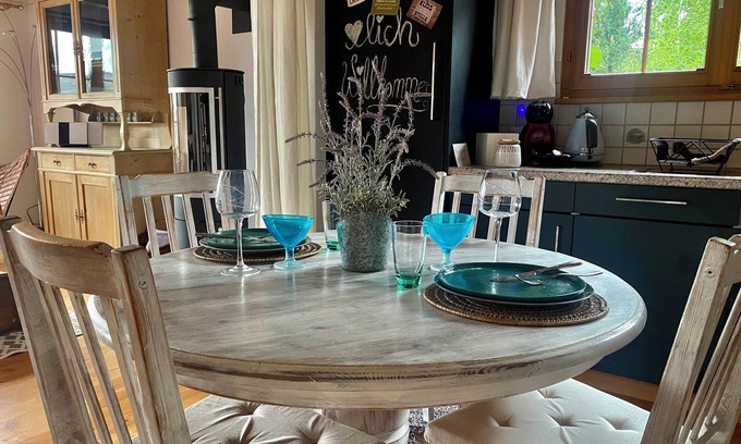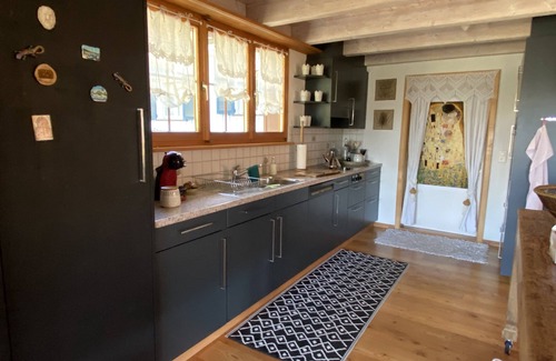 The holiday home is a converted barn which is attached to the house, but is completely separate and leads to the 1st floor with its own entrance. Here you will find a fully equipped open kitchen with living and dining area. In addition, a separate toilet with washing machine and dryer. You can comfortably reach the large balcony (12m2) with table and deck chairs through the generously dimensioned balcony doors.