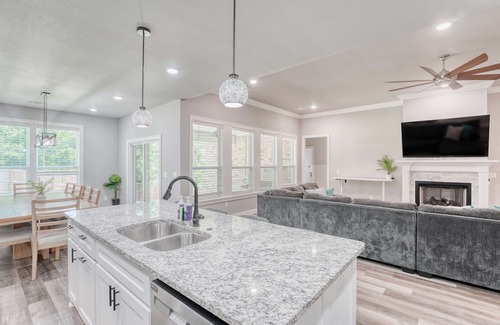 The open-concept kitchen is equipped with stainless-steel appliances, granite countertops, and all the cookware and serveware you need. It flows into a bright dining area and cozy living room with a stone fireplace—perfect for family meals and movie nights.