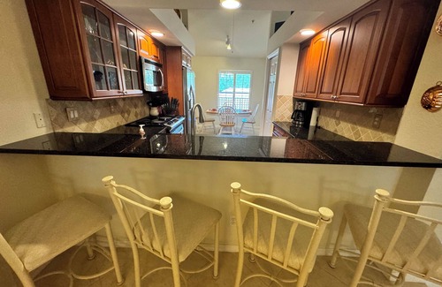 Imperial Golf Estates! Stunning lake and fountain views from your family room and master bedroom showcased by vaulted ceilings and floor-to-ceiling windows! This spacious two-bedroom, two-bath condo is fully equipped for your stay and located in a guard-gated resort community.