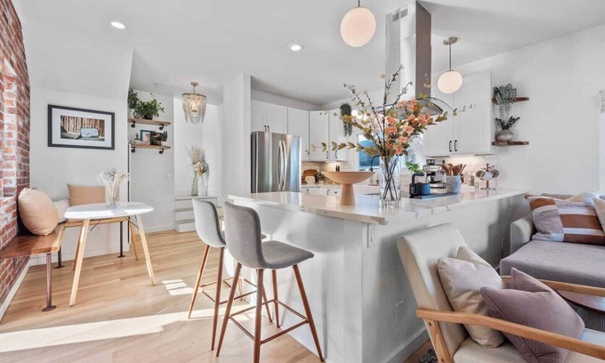 Step inside to a bright, open-concept layout with a fully stocked chef’s kitchen, stainless steel appliances, and breakfast bar + dining nook. The stylish living room has a Smart TV, a cozy sofa bed, and streaming access to Netflix, Hulu, Disney+, HBO Max, Peacock & more.