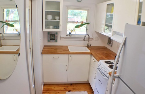 The Bikini Top Cottage sweet spot for couples. Tiny Home in a Cozy Island village. The bungalow is on an alley way that leads directly to the kayak, boat launch, and restaurants. Walk down to view the sunrise coffee in hand with the Sailboat moorings and end your day at The Mar Vista restaurant. Make sure you walk out on the dock and look in the water around the sunken lights.