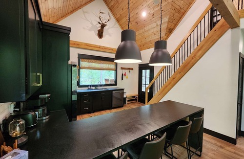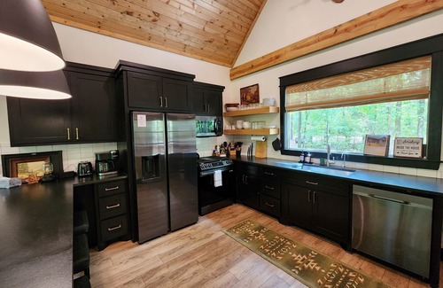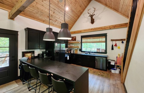 Step inside and feel instantly at ease beneath the cabin’s high-peaked ceilings and rustic charm. The open living room welcomes you with a plush sectional sofa facing a warm fireplace, ideal for cozy evenings in while reconnecting with friends or family over board games or a movie on the smart TV. The kitchen is sleek and stylish with black cabinetry, stainless steel appliances, and counter seating for four—perfect for preparing hearty post-adventure meals.