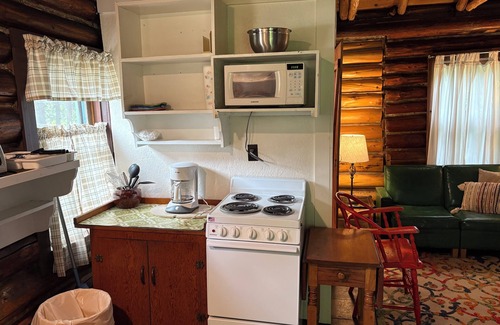 Combination Kitchen/Dining/Living Room: Whip up delicious meals with ease in the fully equipped kitchen while enjoying the rustic charm of the cabin.