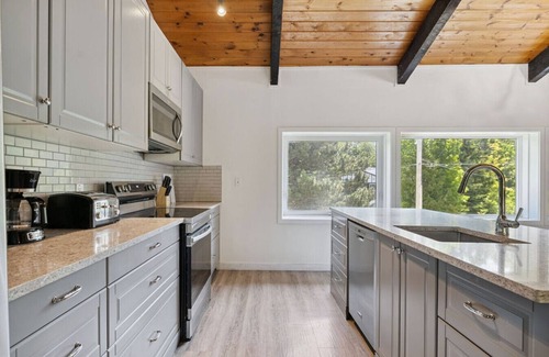 The kitchen is equipped with appliances and cooking basics, convenient for when you're not dining at one of the popular local restaurants. Enjoy your meals in the connected dining area or on the patio. This home includes basic cookware, bakeware, cutlery, utensils, and both a drip and Keurig coffee maker. Just bring your food, coffee, and spices! Garbage bags, paper towels, dish soap and towels, etc will be supplied. The outdoor deck includes seating and a propane BBQ.