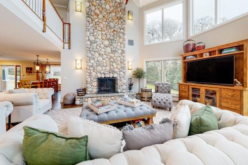 Bird's Paradise offers accommodations in Oak Bluffs, 5.6 miles from Edgartown Lighthouse. The vacation home has access to a restaurant. The vacation home also offers facilities for disabled guests. Leading onto a patio with garden views, the spacious vacation home consists of 4 bedrooms. The air-conditioned vacation home also provides a TV, a fully equipped kitchen with a dishwasher, a seating area, washing machine, and 5 bathrooms with a walk-in shower and a bath. The property has an outdoor dining area. For guests with children, the vacation home features a children's playground. Guests can also warm up near the outdoor fireplace after a day of cycling. Martha's Vineyard Airport is 3.7 miles away.