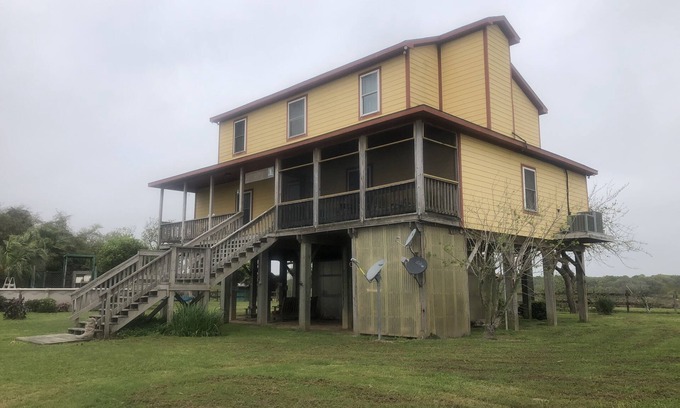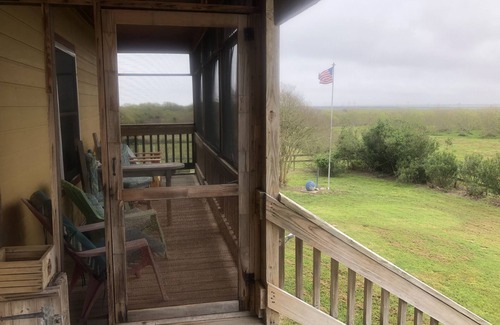 The bumpy gravel road is worth it to the 15 acre private paradise beach home at the top of the hill with a fabulous view of the Gulf and an sun deck. Nested adjacent to the famous Boy Scout Woods Birding site with a view of the bird lands, we are happy to share our home with you, equipped with everything you will need. The first floor of the beach house has a screened porch, living room, dining room (seats 12), kitchen, laundry, and ½ bath. Upstairs is 3 themed bedrooms each with a private bath, bird room (queen), cowboy and Indian room (queen), and Texas USA room (double) as well as a library that can be used with air mattresses. Pets are welcome, but please remember you are in the country and a coyote or pig will cross the pasture in the evening from time to time.