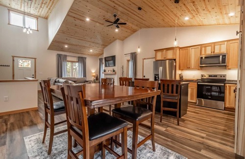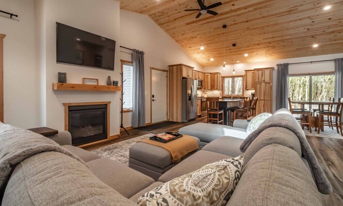 Located on a peaceful half-acre wooded lot, the home features an open-concept floor plan with vaulted wood ceilings and a cozy gas fireplace – perfect for relaxing after a day of activities. The natural hickory kitchen and alder doors/trim bring a rustic touch to the modern design, while the LVP flooring adds style and durability throughout. With 4 king-bed bedrooms and 2 full baths, there’s plenty of room for your friends and family for a short getaway, or it could easily serve as a longer-term rental.