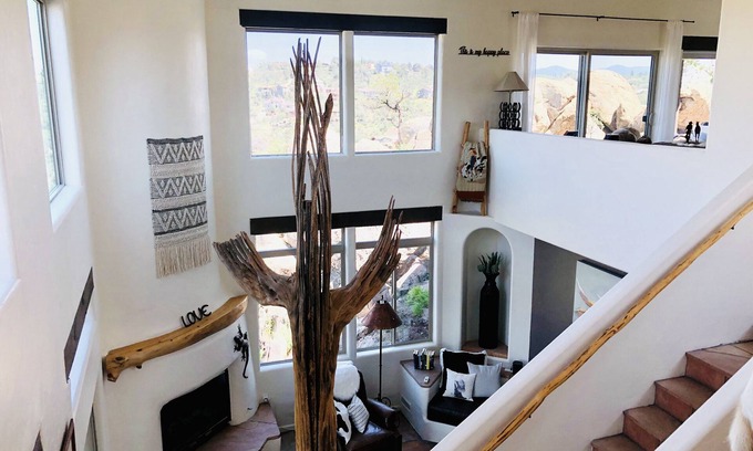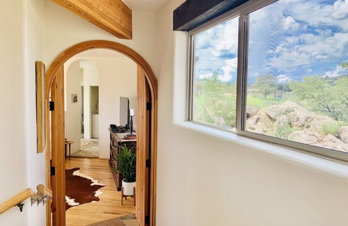 Your first experience will be the spectacular boulders as you approach this Southwestern adobe house. Arriving after dark? This is a treat as the illumination featuring the property brings the topography to life. Enter with ease as you access the house with a smart lock for your convenience. Once in the flagstone foyer, kick off your shoes, drop your luggage and continue to the landing the that leads to the first-floor open plan living space. The soaring 2 story ceilings invite you to the living room with gas fire place, built in adobe couch, and chairs, as well as western wood and comfortable leather chairs. Boulders and tree views from the windows as well as alcoves for décor and alternative lighting. The Living room opens to the large patio for dining or lounging. Another fun place in the house is our breakfast nest. Enjoy your morning coffee of afternoon treats surrounded by windows and natural light, as you sit on the bench seating or western chairs around the table made from original coyote fence and patina metal. For your dining experience, enjoy the large dining room with custom furnishings and more view windows. The dining room is close to the uniquely yet simply designed kitchen with natural wood cabinet doors and Italian tile and yes....a wall of windows to take in the evening sunset as you prepare your meal at the kitchen Island. On the same floor is an adobe powder room for your convenience. Who thought walking up a stairs would be an experience... Ascend, glance around, and take a breath as the view gets greater and greater as you step onto the landing balcony and reading area with an assortment of books for your pleasure. Walk through the arched wooden door to the master bedroom, bathroom and balcony suite. This amazing room has a king size bed next to the picture window. Enjoy lounging in the large comfy double chair by the fire or watch your favorite Netflix show before you retire to the luxurious bed for the evening. The master bedroom has an open floor plan with the 4th wall as a loft wall so your vision is extended across the ground floor to take in more views through the wall of 2nd floor windows. The master bathroom is adorned with unique Italian tile, octogen double sink vanity, shower with bench seat, separate toilet room, laundry facilities, and a separate jet tub to soak in beneath the picture window enjoying the surrounding boulders and extended views. Don't forget the bubbles! The 2nd sleeping room across the landing, offers a queen metal bed and an office desk and chair situated to take in the views from the sliding doors that leads to a small balcony. This room is also en-suite with a bathroom including an enclosed shower. The 3rd bedroom has queen bed and is set up with a coffee bar and kitchenette as it's on the lower floor of the house. This bathroom is also en-suite with a european shower room. This is a unique bathroom as its built into the existing boulders. The exterior of the house and property has very natural topography which includes, steps leading down to the pond,walkways, and intimate seating spots in the boulders, trees, cactus, grasses, and artistic sculptures for you to relax and call home while you stay.