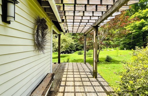 Downstairs, there are two porches on opposite sides of the house. The charming little screened porch at the front of the house gets lovely afternoon light - perfect for relaxing with a book and a cup of tea. The covered back deck faces the creek and is an absolutely magical setting for summer dinners. There is a Weber gas grill and the dining area comfortably seats six. Enjoy the woodland views by the creek on the Adirondack chairs or hang by the fire pit and immerse yourselves in the birdsong and tranquillity.