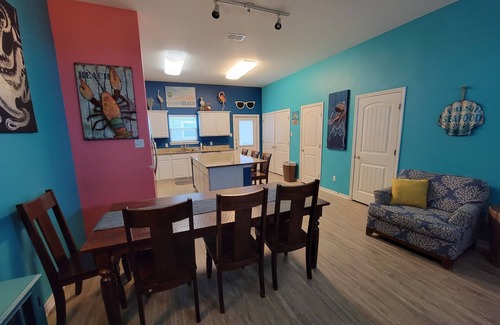 This beautifully designed 2-story townhome features an open floor plan that encourages togetherness, showcasing a full kitchen equipped with a large granite island and all essential dining utensils. The spacious dining area comfortably seats eight, while the inviting living room offers additional space for relaxation and entertainment, featuring a convenient queen-sized cabinet bed for extra guests. Each of the three bedrooms on the second floor promises comfort, including a master suite with a king-size bed and private balcony boasting spectacular beach views. With amenities such as multiple TVs, cable, Wi-Fi, a laundry room, and a fenced-in patio with picnic seating, this property ensures a comfortable stay for you and your loved ones during your wedding festivities.