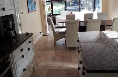 The house itself has an ensuite king sized bedroom with private balcony.There are 2 double bedrooms ,one en suite.Two further bedrooms share a bathroom.Please come and make our home,your home and enjoy a relaxing holiday.We live here but in a self contained loft conversion. We share a front door but none of the living space. Our home would be your home for the duration of your stay.