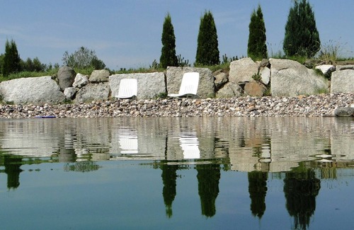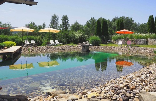 The Birkholmhof is a very idyllic holiday farm in a south-facing slope with panoramic views and a natural pool at Bärnau in Bavaria, in the Upper Palatinate Forest on the border with the Czech Republic. Rest and peace for your vacation can be found in our well - maintained 4 - and 5 - star non - smoking apartments and rooms. Overnight at the small campsite and in the hut. Ideal for families and groups. Accommodation with natural pool, separate group room for 30 people at the fireplace, climbing wall / boulder wall, playground, wood-burning sauna in the log house by the pool. Vierseithof in a secluded location, ideal for nature lovers and athletes for biking, hiking, fishing, climbing, mountain biking and cross-country skiing. With drinks and bread service, bike rental with child seats, 2 e-bikes in our wood-burning outdoor sauna, you can relax by the crackling stove really. The Finnish sauna is right next to the pool and will only be heated for you on request (for a fee).