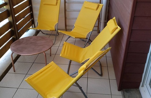 large balcony (table, chairs, garden chairs) to the east (morning sun and shade in the heat ..).