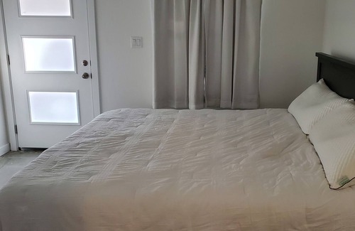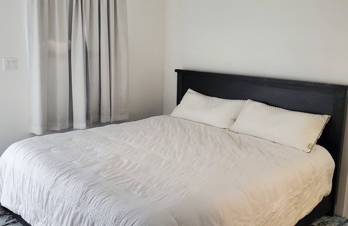 Inside, you'll find a spacious living room, a medium-sized kitchen stocked with essentials, and a cozy bedroom featuring a king-size bed. For additional guests, the queen-size pull-out couch in the living room offers comfortable accommodation.